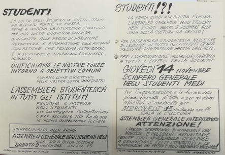 Nel Dicembre del 1967 viene convocata la prima assemblea degli studenti universitari, che sancisce la nascita del movimento studentesco modenese che si farà ideatore delle lotte nel ’68. Le prime discussioni riguardano il problema dell’autoritarismo, che in varie scuole limita le libertà personali: si propone di costituire all’interno delle assemblee un gruppo di studio che individui i problemi dei singoli istituti e della scuola in generale.